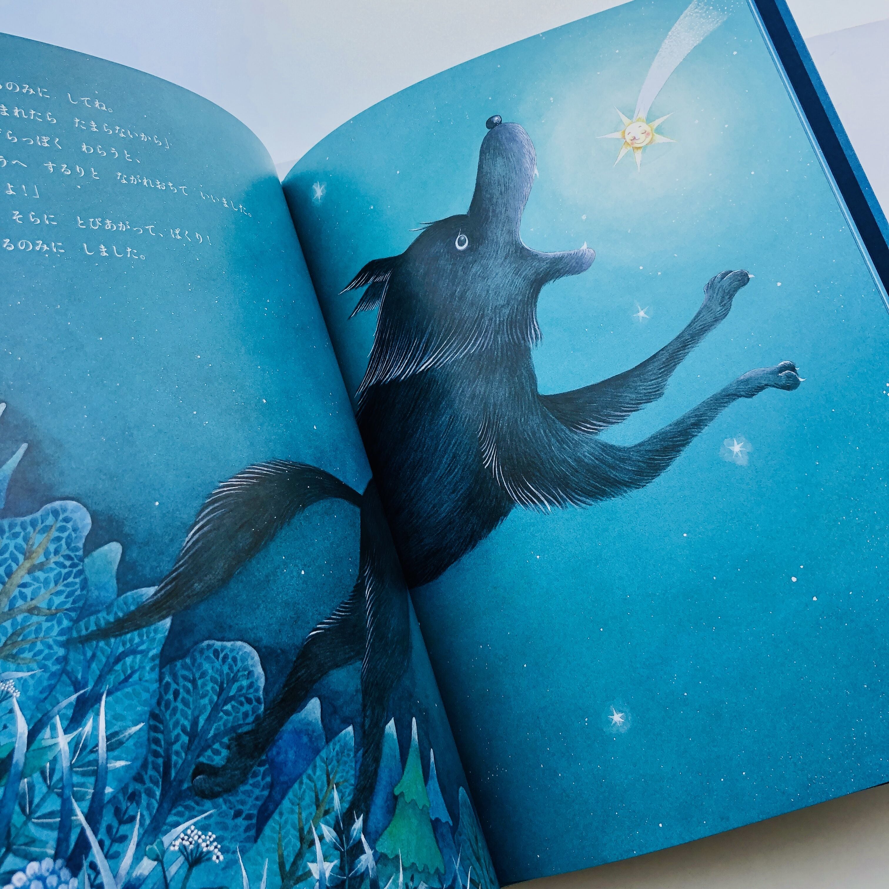 ひとりで自由気ままに暮らしているいっぴきおおかみが、ある夜、うさぎ座のしっぽで輝くお星さまに出会います。いつも同じ場所で輝いていることに少しつかれたお星さまは、自由ないっぴきおおかみに憧れていると語りかけます。一方、おおかみは、時々からっぽみたいな気持ちになることを打ち明けます。そこで、ある名案を思いつき、両者はひとときを一緒に過ごすことにしますが……。優しいおおかみと、無邪気で明るいお星さまの、おたがいを思いやる友情と安息に満ちた癒やしの絵本。